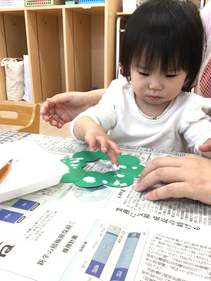 0歳児は絵の具の感触を楽しみながら指スタンプができました🤗