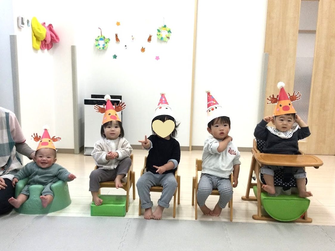 0歳児は手形でトナカイさんの角を表現した帽子、1・2歳児はサンタさんの帽子をそれぞれ被って