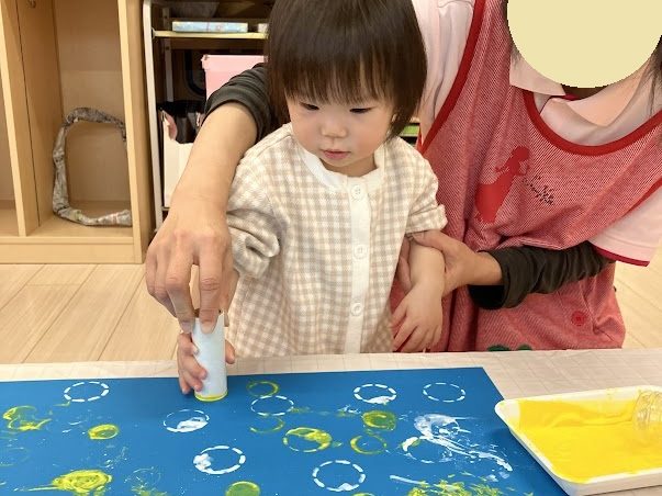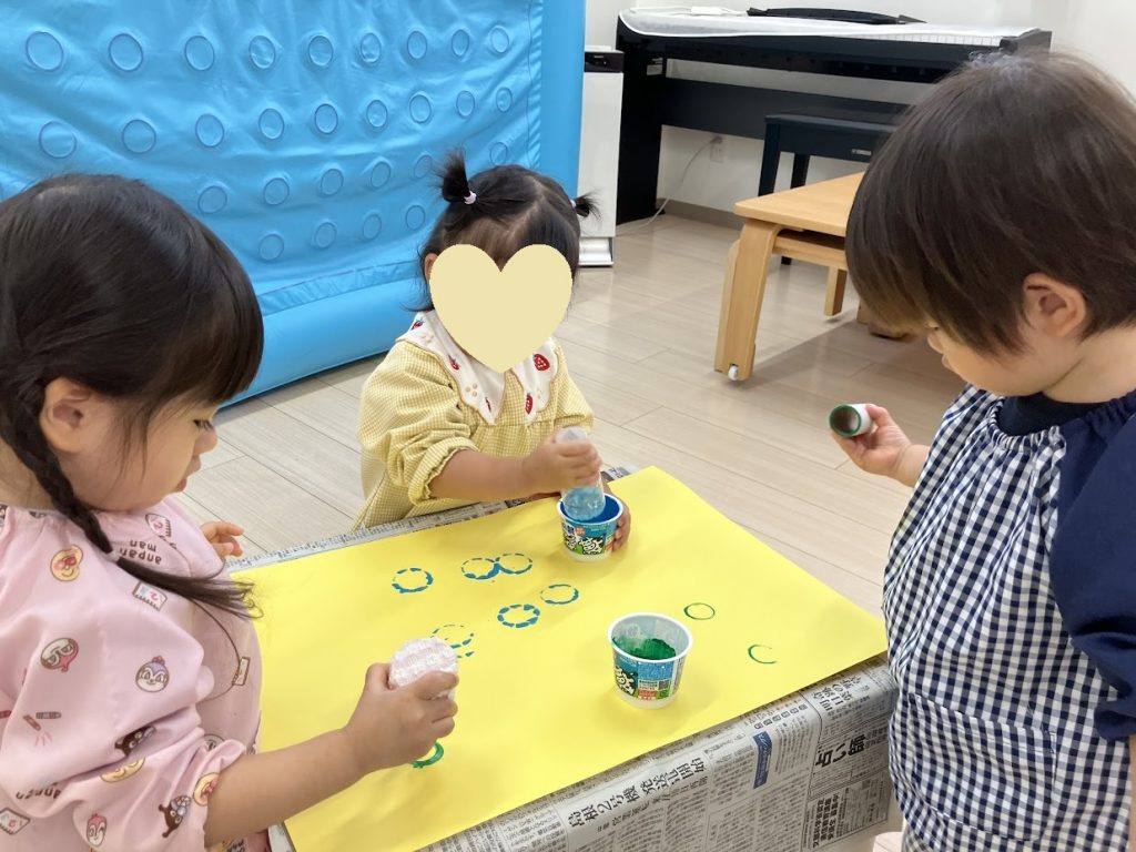 画用紙に、ヤクルト容器やラップの芯を使ってスタンプ遊び🎨