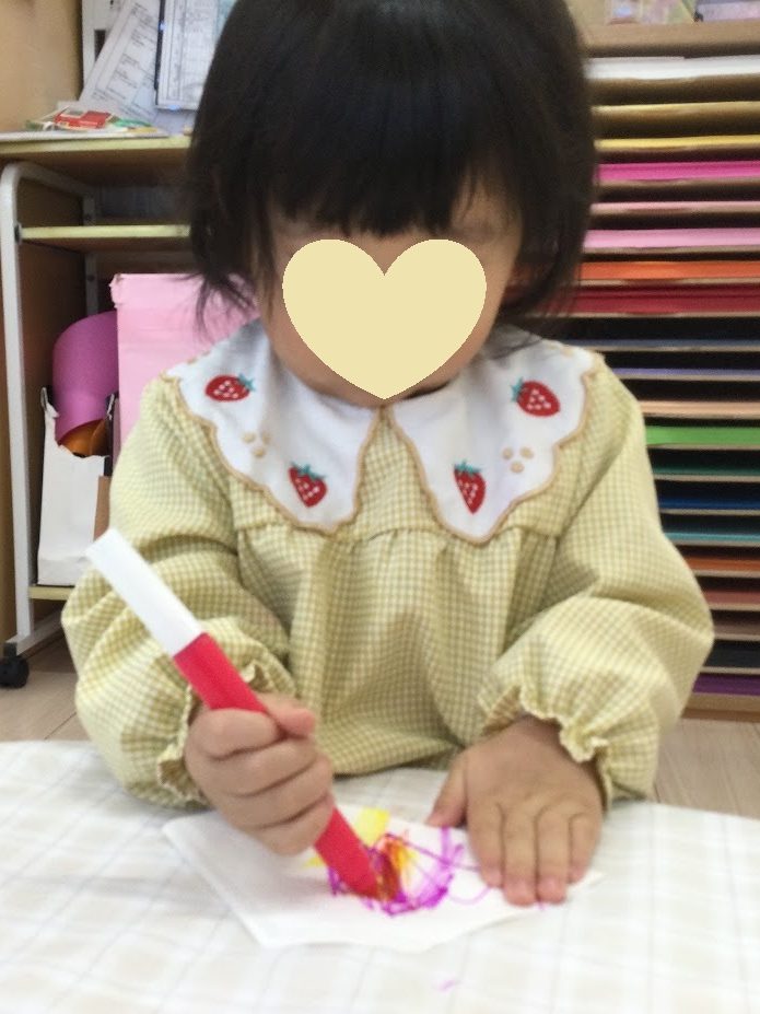 1、2歳児さんは水性ペンでコーヒーフィルターになぐり描きをした後、水をつけた筆でぬりぬり🎨