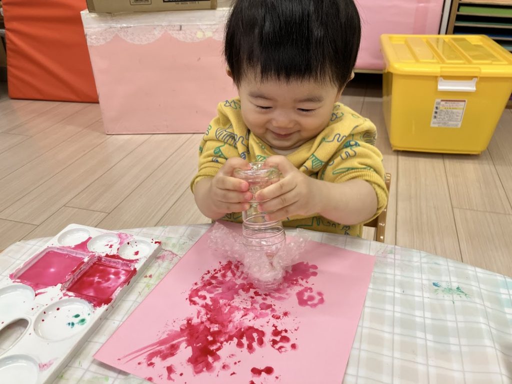 最初はポンっと押すのが難しく、滑るように押してしまうこともありましたが、何回もするうちにポンポンっとプチプチの形が残って、お花のように押すことが出来ていました✨