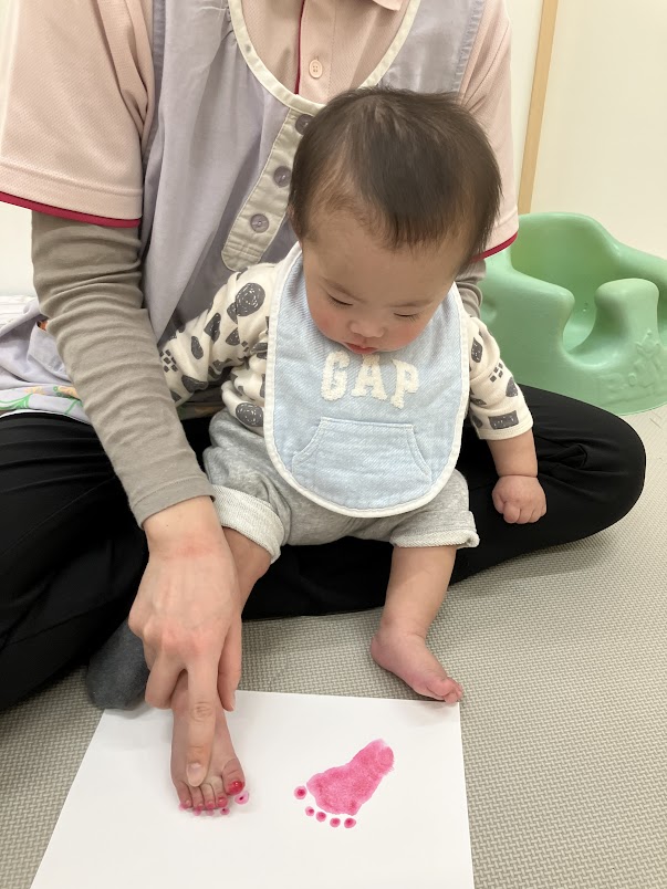 スタッフが絵の具を足裏に付けていると、絵具や筆の感触に不思議そうな表情になったり何をするのかな?💭と前のめりで見たりと興味津々!ペッタンと可愛い足形が出来ました🥰