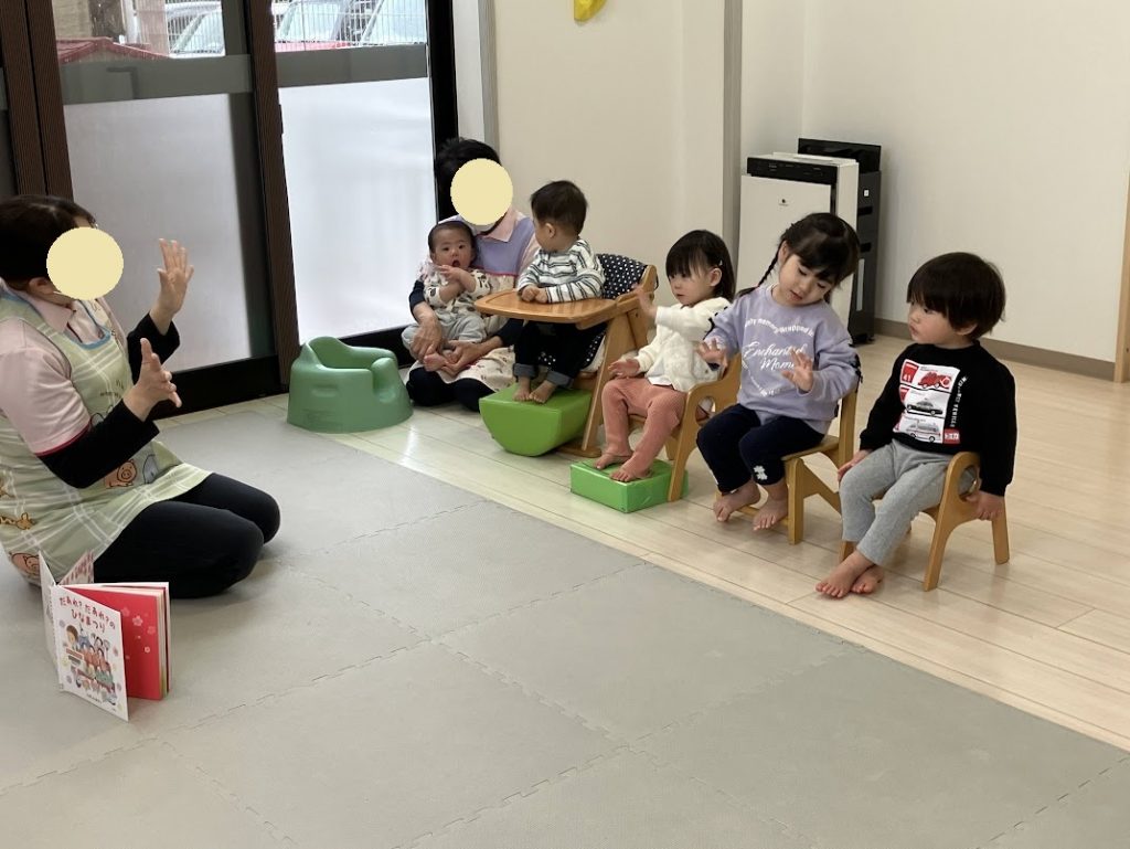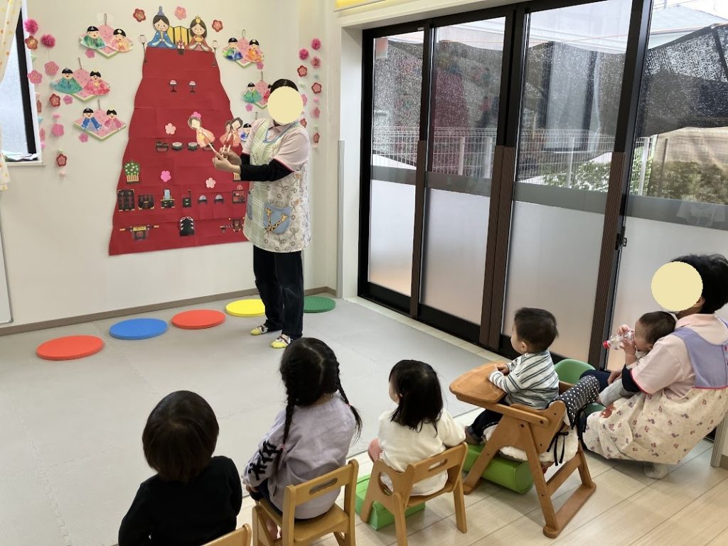 絵本の途中に出てくる「うれしいひなまつり」の歌詞にあわせて音楽をかけると、スタッフの真似をして身振り手振りをしたり体を揺らしたりと、とっても可愛らしかったです💕