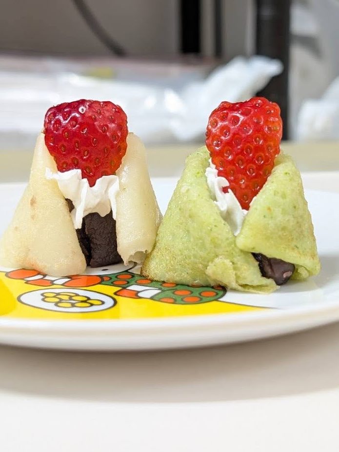 給食ではちらし寿司を食べ、午後のおやつはいちごとあんこのおひなさまクレープと、ひなまつりづくしの行事食☺️