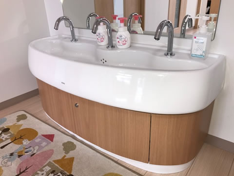 うがい手洗いは入室時、手洗いはおやつ前後・給食前にも実施します。