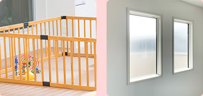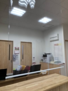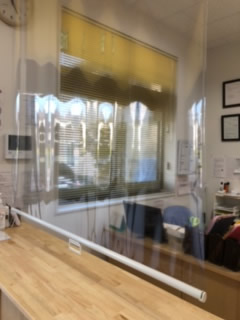来客時の飛沫防止用に透明のロールスクリーンカーテンを設置しています